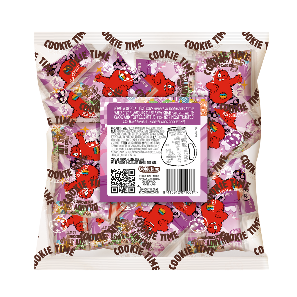 - 20x 15g individually wrapped Brandy Snap White Choc Chunk Cookies